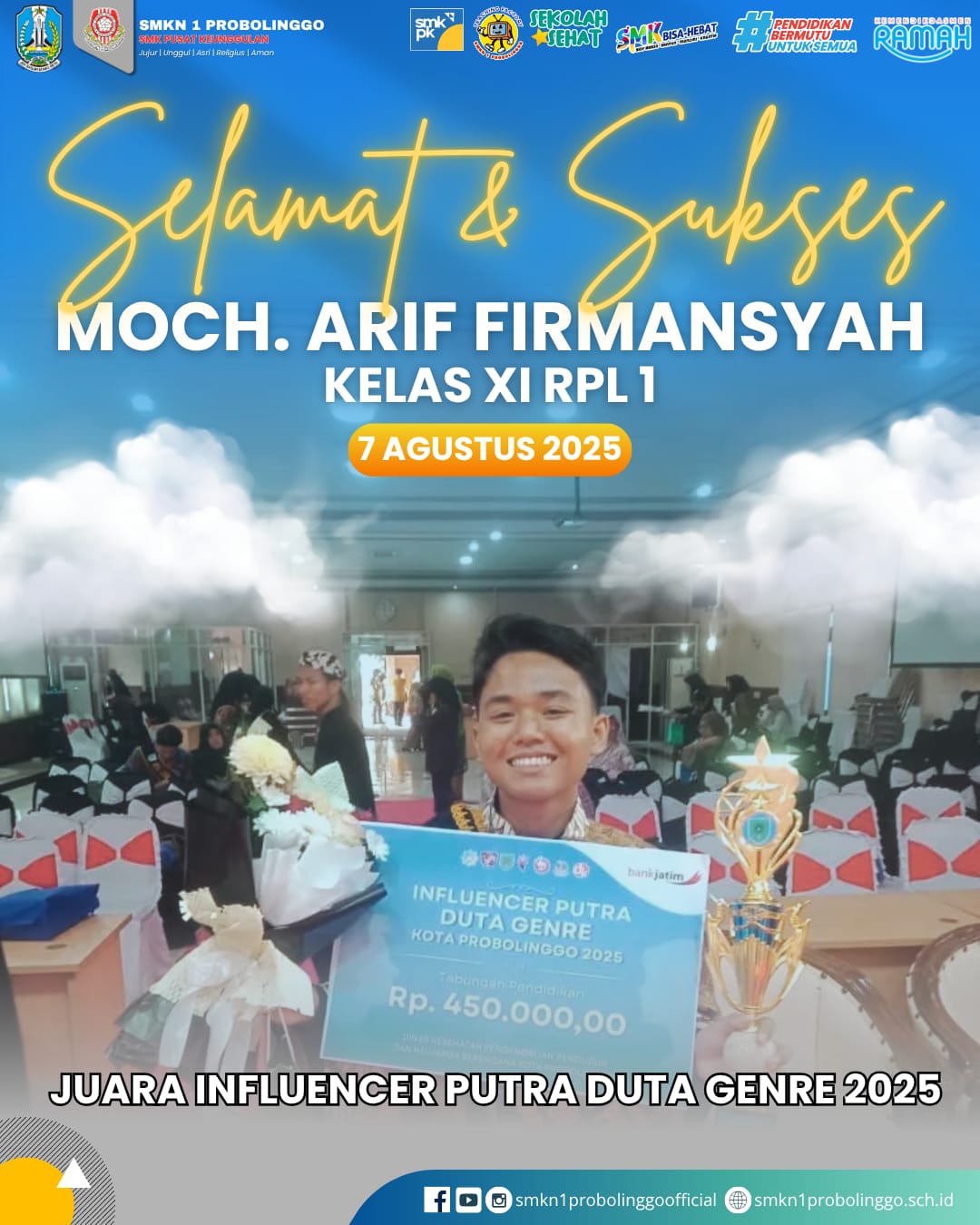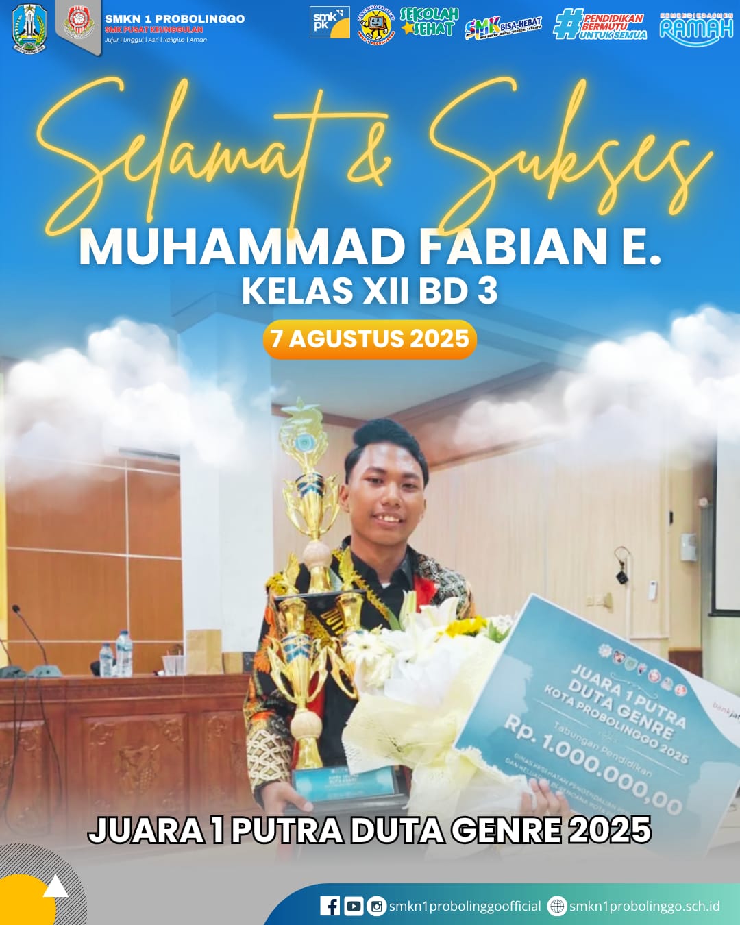 Muhammad Fabian Erlangga, siswa Kelas XII BD 3, berhasil meraih gelar Juara 1 Putra Duta Genre Kota Probolinggo 2025. Prestasi ini diraih berkat penampilan memukau dalam sesi presentasi, wawancara, serta kepiawaian menjawab pertanyaan dewan juri.