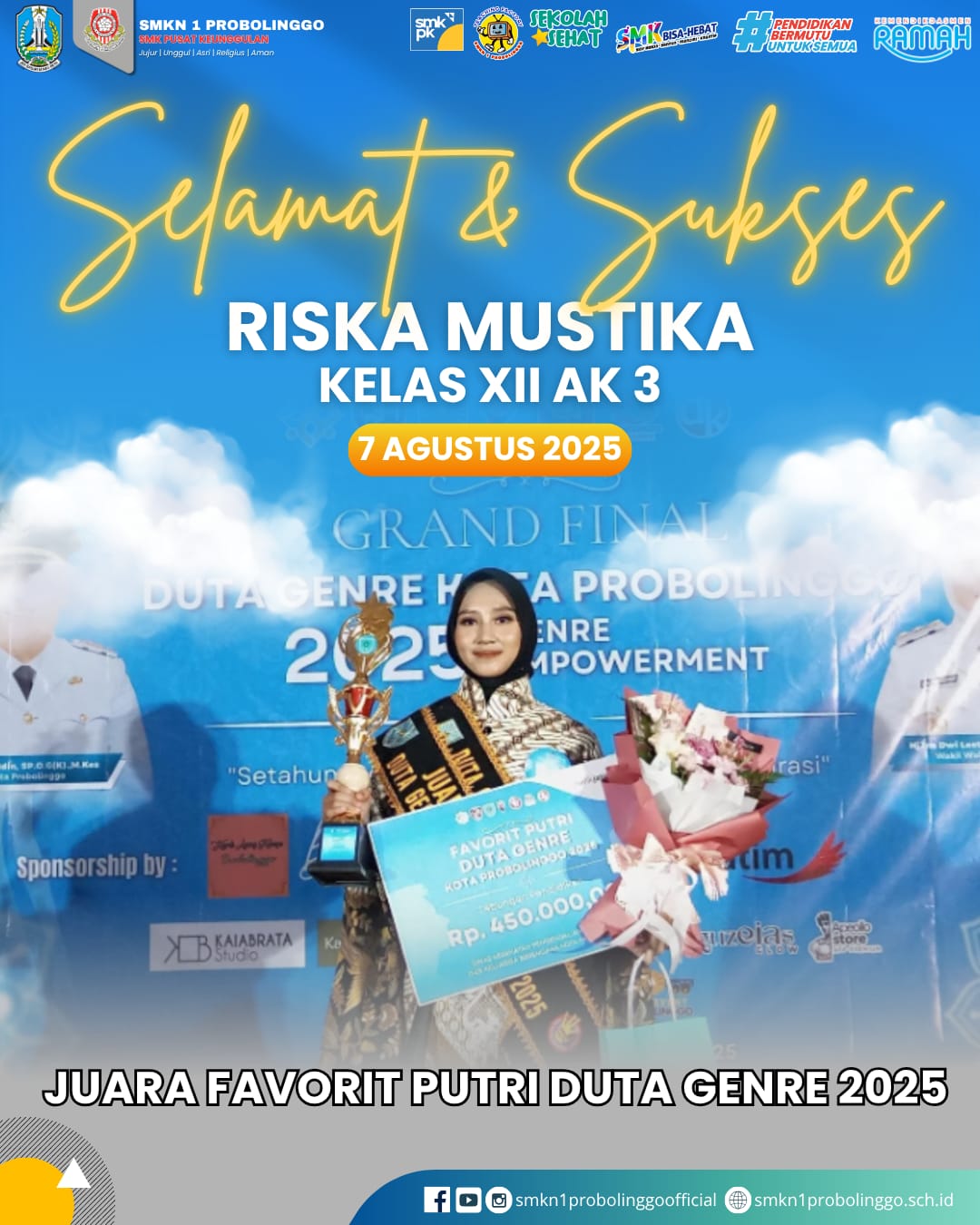 Riska Mustika, siswi Kelas XII AK 3, sukses meraih gelar Juara Favorit Putri Duta Genre 2025 berkat dukungan dan voting terbanyak dari masyarakat, serta penampilan yang penuh percaya diri.