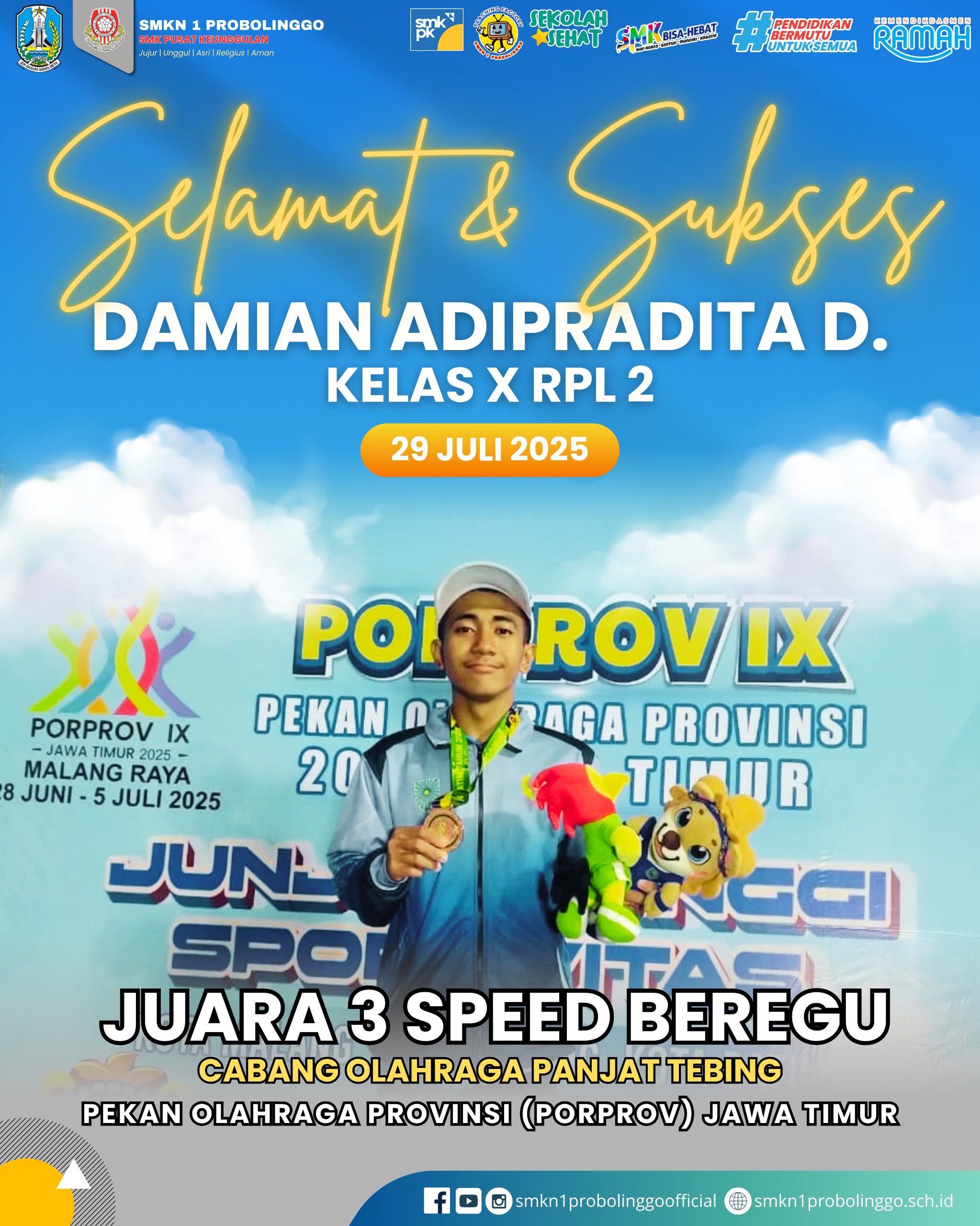 SMKN 1 Probolinggo kembali menorehkan prestasi membanggakan di ajang olahraga tingkat provinsi. Damian Adipradita Daniswara, siswa kelas X RPL 2, berhasil meraih Juara 3 kategori Speed Beregu cabang olahraga Panjat Tebing dalam Pekan Olahraga Provinsi Jawa Timur (PORPROV Jatim IX) Tahun 2025 yang diselenggarakan di Kota Malang dan Kota Batu.