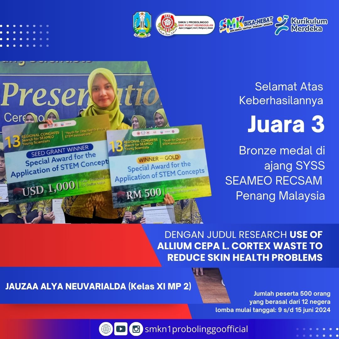 Probolinggo, 4 Juli 2024 – Siswi SMKN 1 Probolinggo kembali mengharumkan nama Indonesia di kancah internasional. Kali ini, Jauzaa Alya Neuvarialda dari kelas XI MP 2 berhasil meraih juara 3 di ajang SEAMEO Young Scientists 2024, yang diadakan di Penang, Malaysia, dari tanggal 9 hingga 15 Juni.